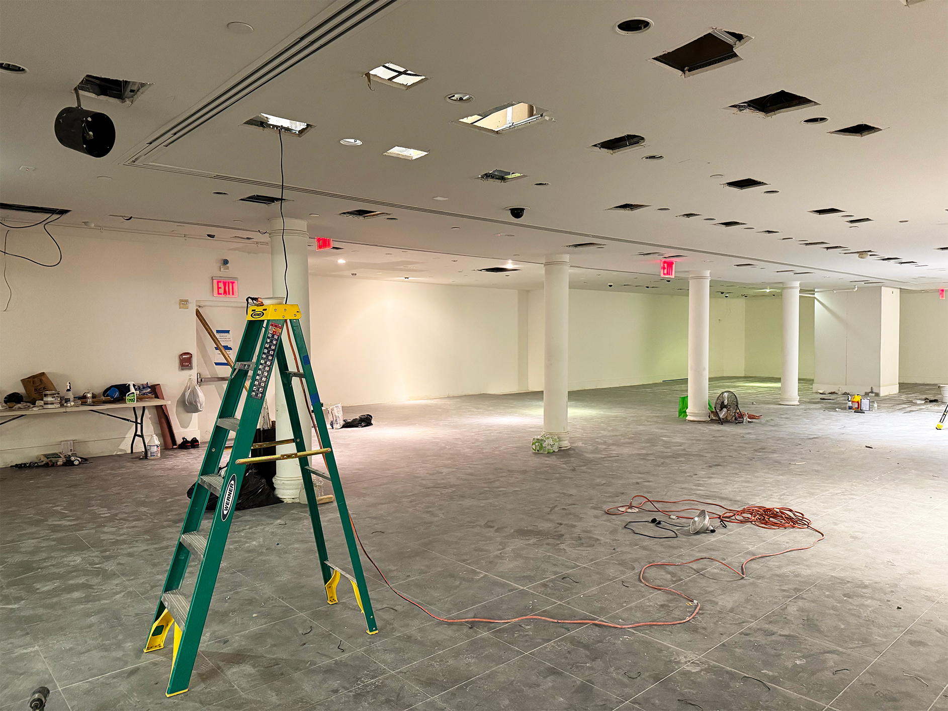 To complement our fieldwork, we deployed LiDAR scanning to document the ceiling plane in high detail. In the absence of a reflected ceiling plan, LiDAR gave us RGB-enhanced point clouds, allowing us to map lighting, fixtures, and soffits with precision. These scans became the foundation for a highly accurate 2D drawing set, essential for coordinating layout, lighting, and HVAC systems.
