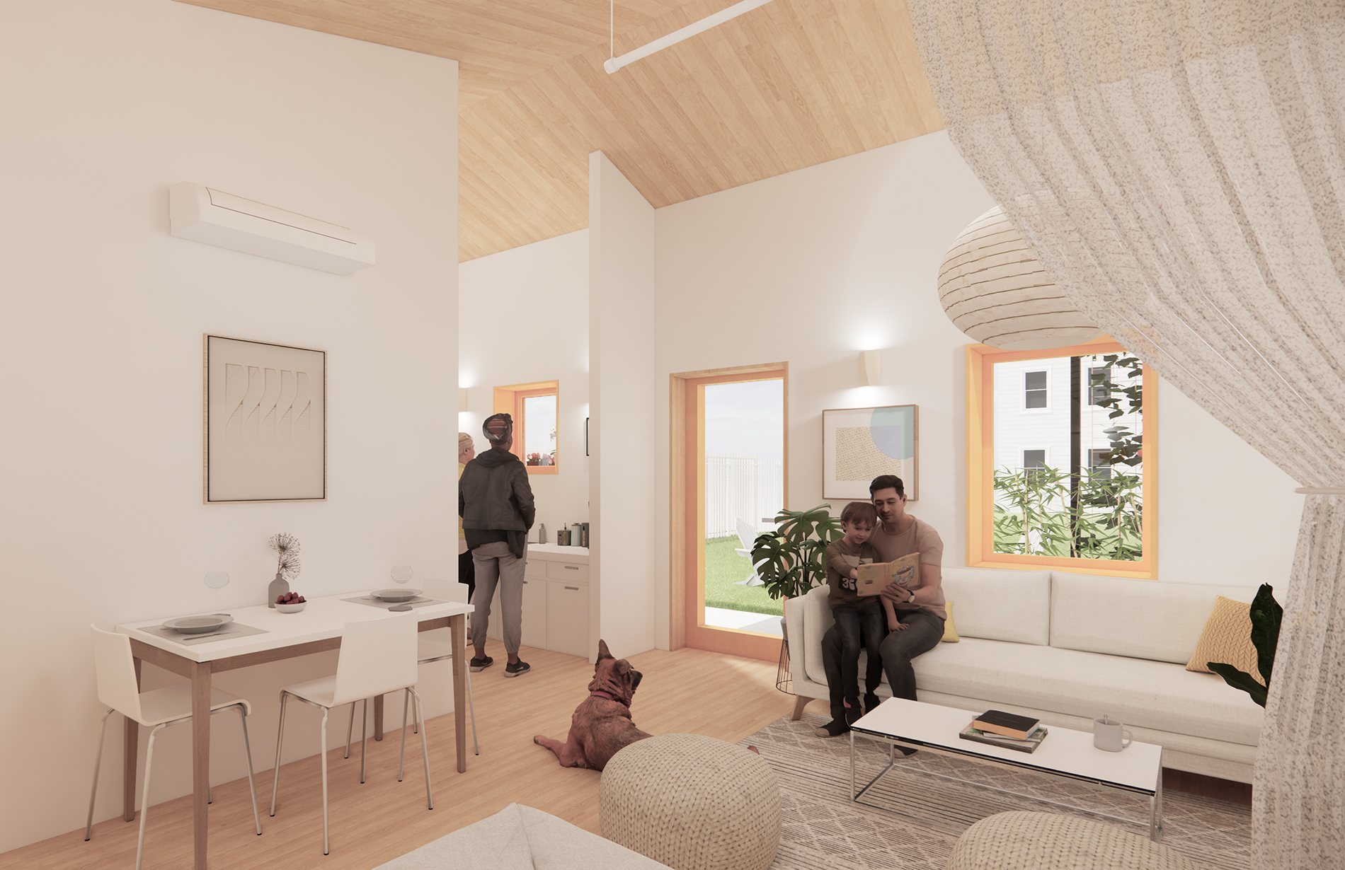 The Excelsior ADU in particular maximizes value for occupants, owners and the environment by integrating energy-efficient technologies and sustainable materials in accordance with Passive House Standards. An efficient thermal envelope is developed through a simple double stud wall and utilizes recyclable, local materials for framing, insulation and finishes, complete with high performance windows and doors. In addition, Its design incorporates features such as heat pump HVAC and hot water systems. These solutions make the building highly sustainable with excellent interior air quality and noise isolation. The multifaceted benefits of Passive House in the Excelsior ADU increase its accessibility to more occupants while minimizing waste and promoting a circular economy.