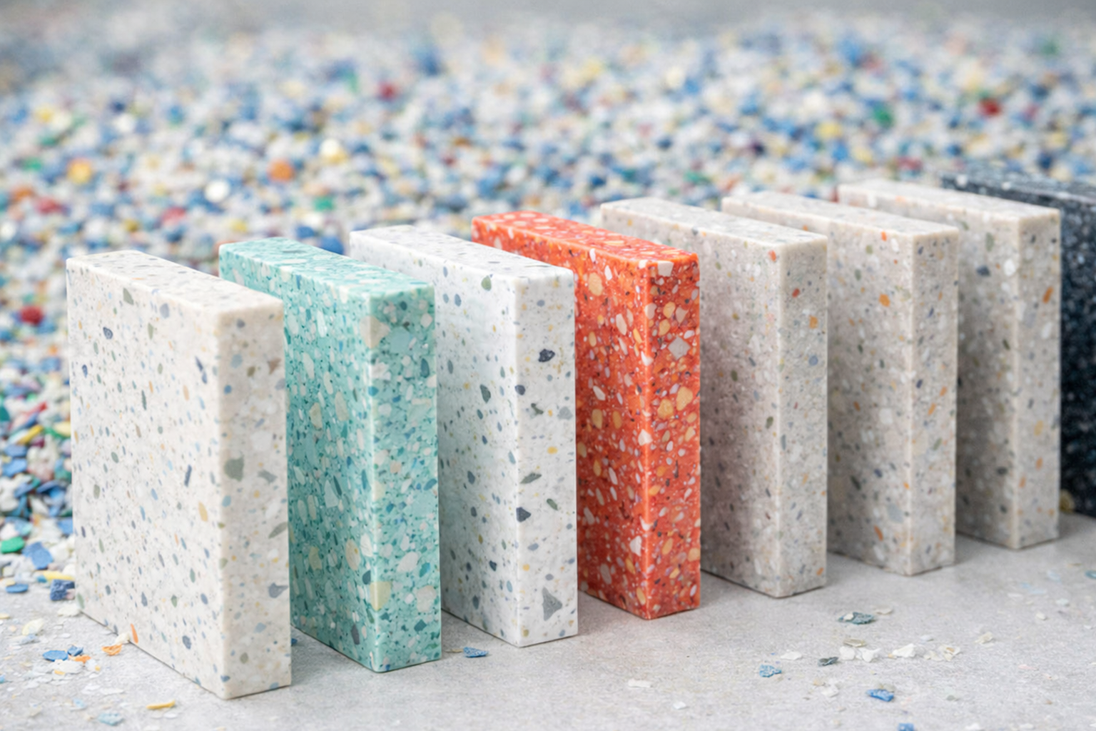 Designers value recycled solid surface for its combination of creative flexibility and everyday resilience. Available in a broad spectrum of colors — from subtle neutrals to bold tones — these materials can be customized to match any project palette. The visible recycled particles often give each surface a unique, tactile quality that pairs well with wood, metal, and concrete.