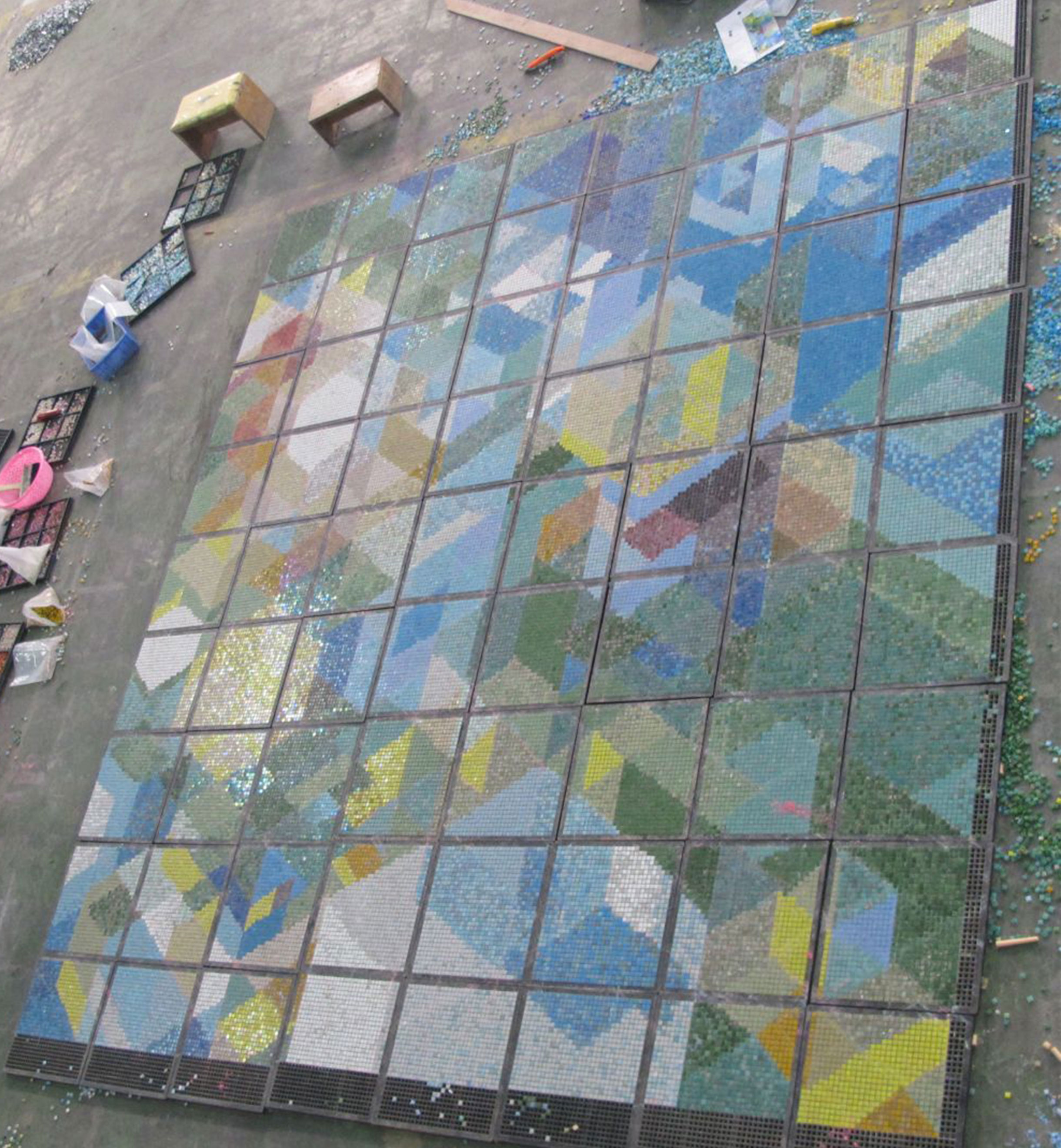 The custom image is composed of specialized 10mm X 10mm tiles and is being assembled in Japan.