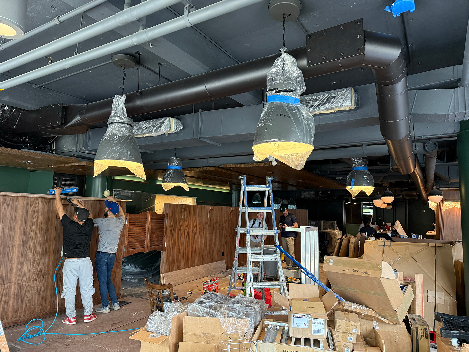 Adding complexity, the restaurant ceiling was a maze of existing systems: ductwork, lighting, fire protection, and an integrated A/V setup. Any proposed intervention had to work around and within these limitations.