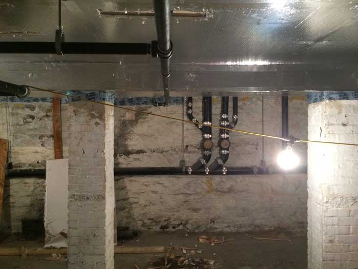 Finally, any penetrations of water, sewer and new sprinkler pipes from the cellar through the floor are properly gasketed and sealed.
