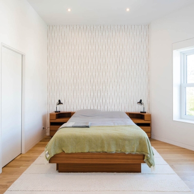 We chose dense-pack cellulose insulation, which is a non-toxic wood-based product that, when blown into frames, can fit tightly into enclosed areas and around obstructions such as wires and ducts. The Intello holds the cellulose in place, and also allows humidity to migrate out of the cavity during the warm summer months.