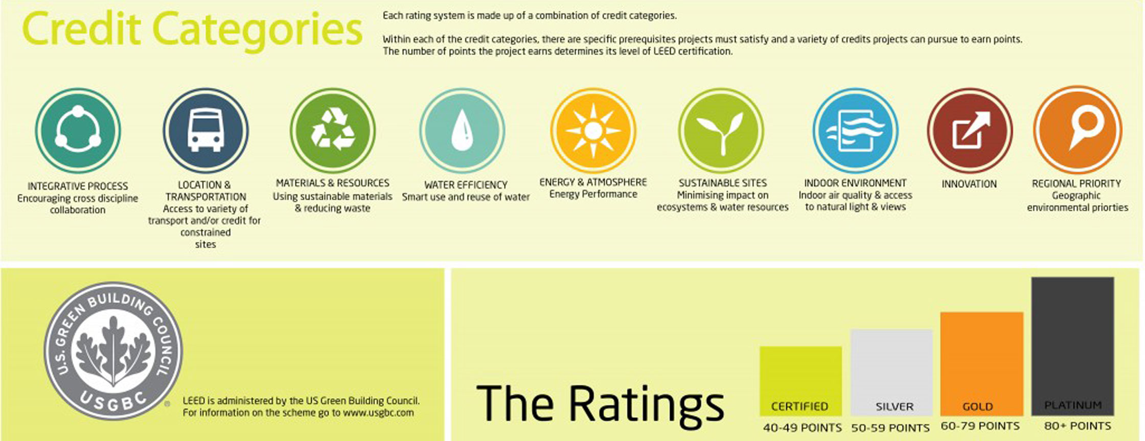 - • Certification is based on Points which can be collected across eight different categories, including Materials & Resources, Indoor Environmental Quality, and Water Efficiency and will result in rating levels from Certified up to Platinum.
