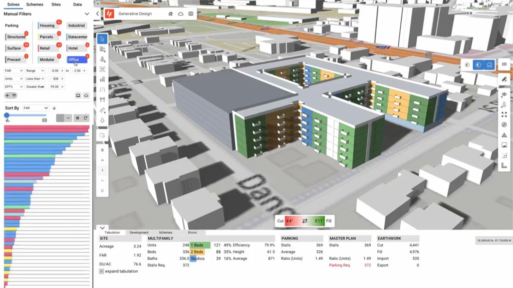 Built as a generative planning engine, TestFit excels at quickly generating and optimizing building layouts based on program requirements, parking constraints, and zoning rules. With intuitive inputs (unit mix, target yield, site shape), it creates test fits in seconds—ideal for multifamily developers, housing authorities, or firms conducting rapid feasibility studies. Its strengths lie in real-time iteration and visual clarity, but it performs best when the design brief is already well defined. Integrating with Revit and AutoCAD is possible via exports, though data loss and cleanup are often required. TestFit augments programming—it doesn’t replace the need for a designer’s insight into adjacency or spatial narrative.