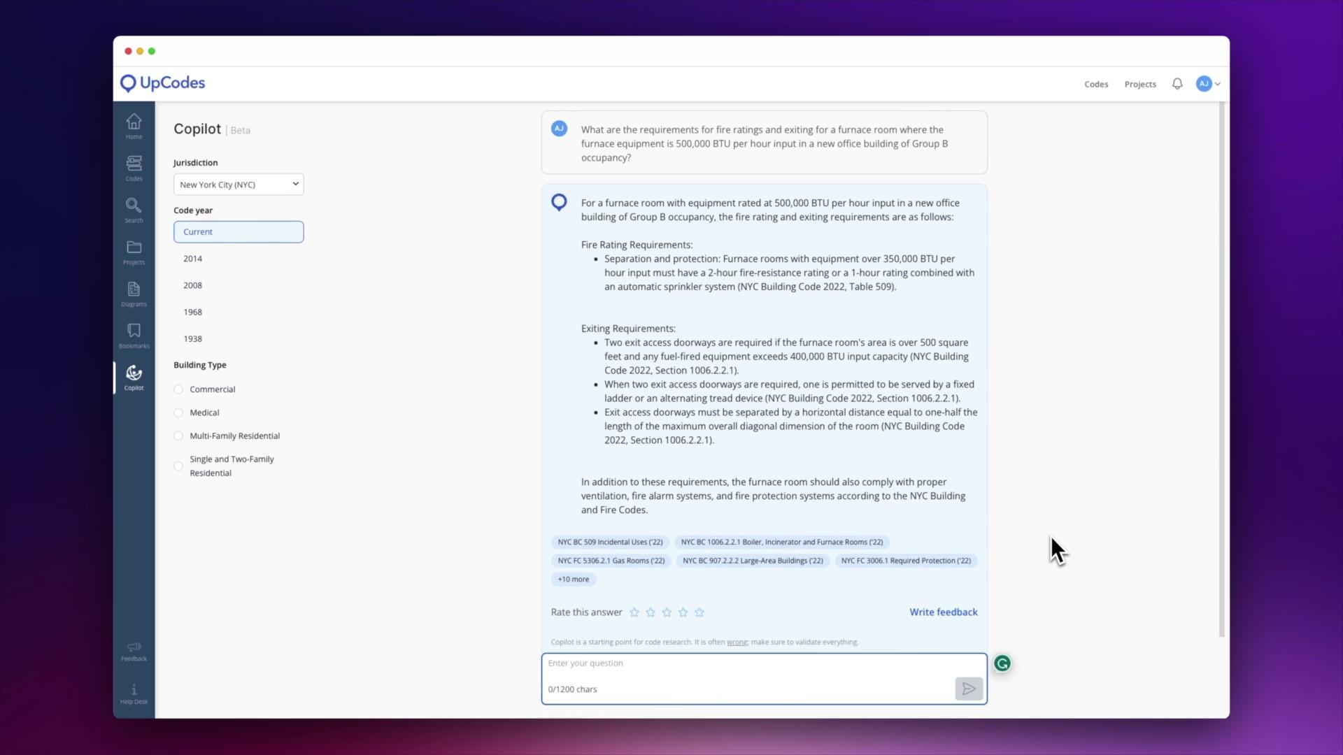 Regulatory constraints often shape projects before design begins, and UpCodes AI brings the power of NLP to code compliance. Architects can query local zoning and building codes in plain language—What’s the minimum corridor width for a preschool?—and receive targeted responses. For small firms without in-house code experts, this is a major time-saver. It works within web browsers, integrates lightly with BIM workflows, and delivers solid accuracy for standard use cases. Still, it’s not a substitute for judgment: edge cases, historic overlays, or client-specific compliance strategies require human expertise. It augments research, but doesn’t replace legal or regulatory review.