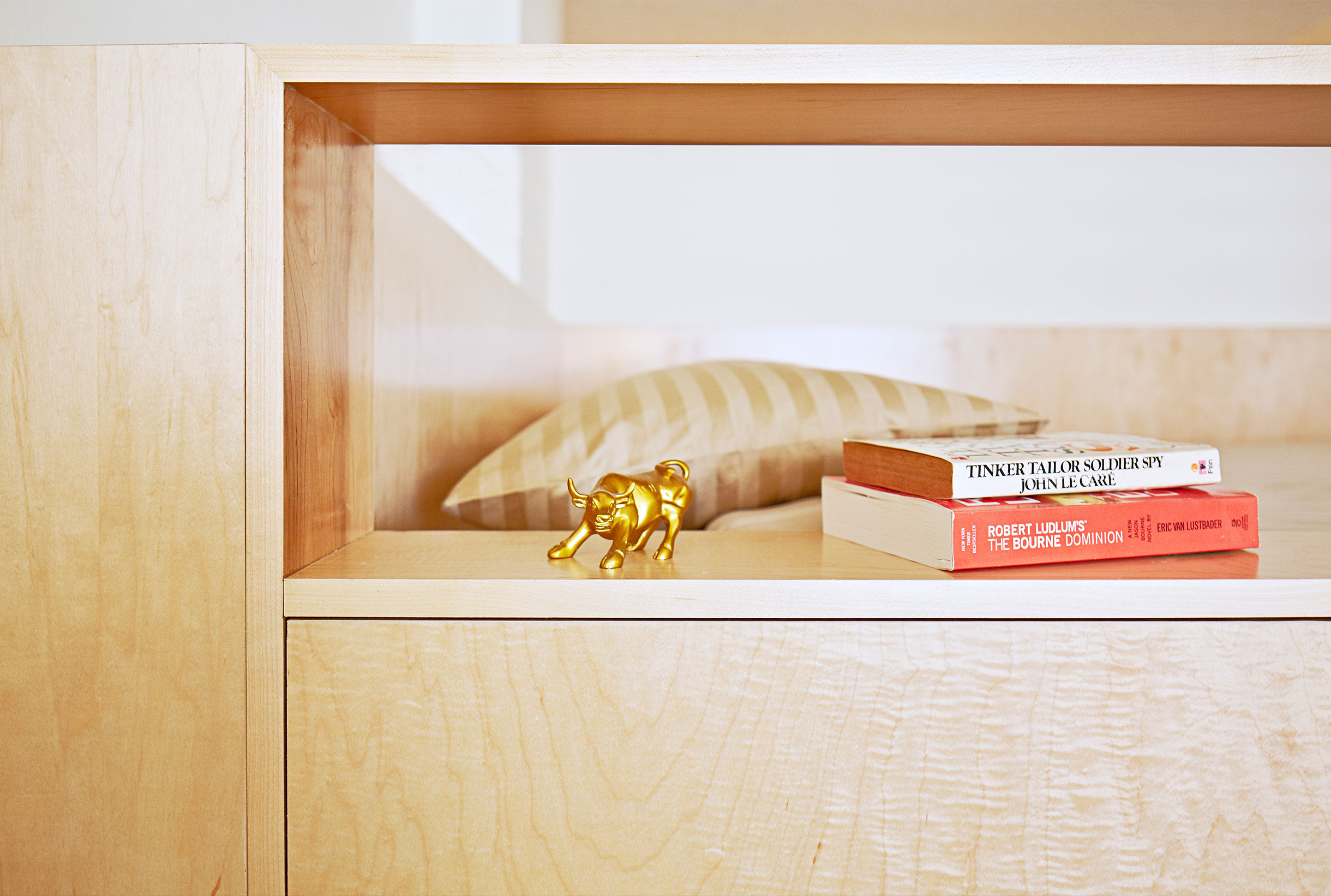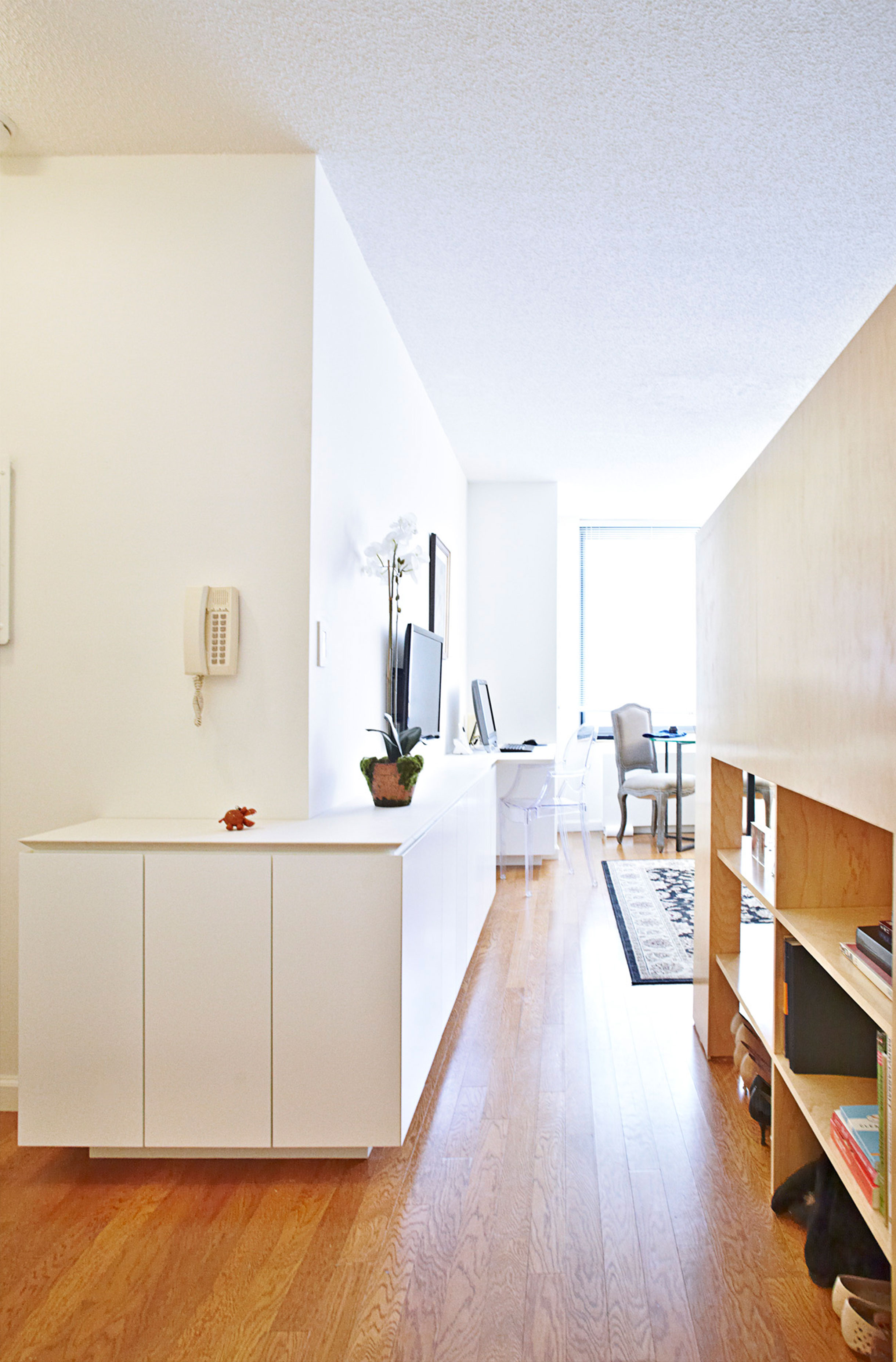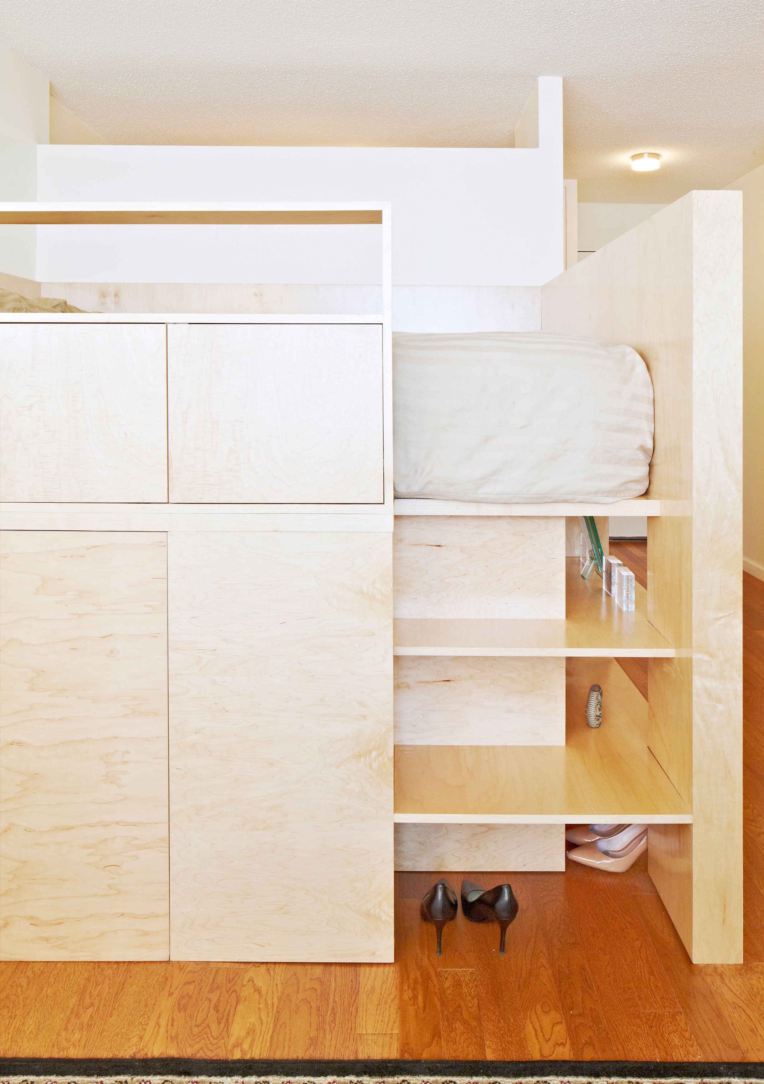 The classic challenge of the studio apartment - how to separate the sleeping area from the living space - is solved via a custom-fabricated millwork insertion. Incorporating space for a queen bed, as well as cabinets, an integrated ladder, deep storage below, and books and display shelving on the side, the unit functions as an elegant room divider furniture piece. The unit was pre-fabricated off site and required only a day for assembly and installation.