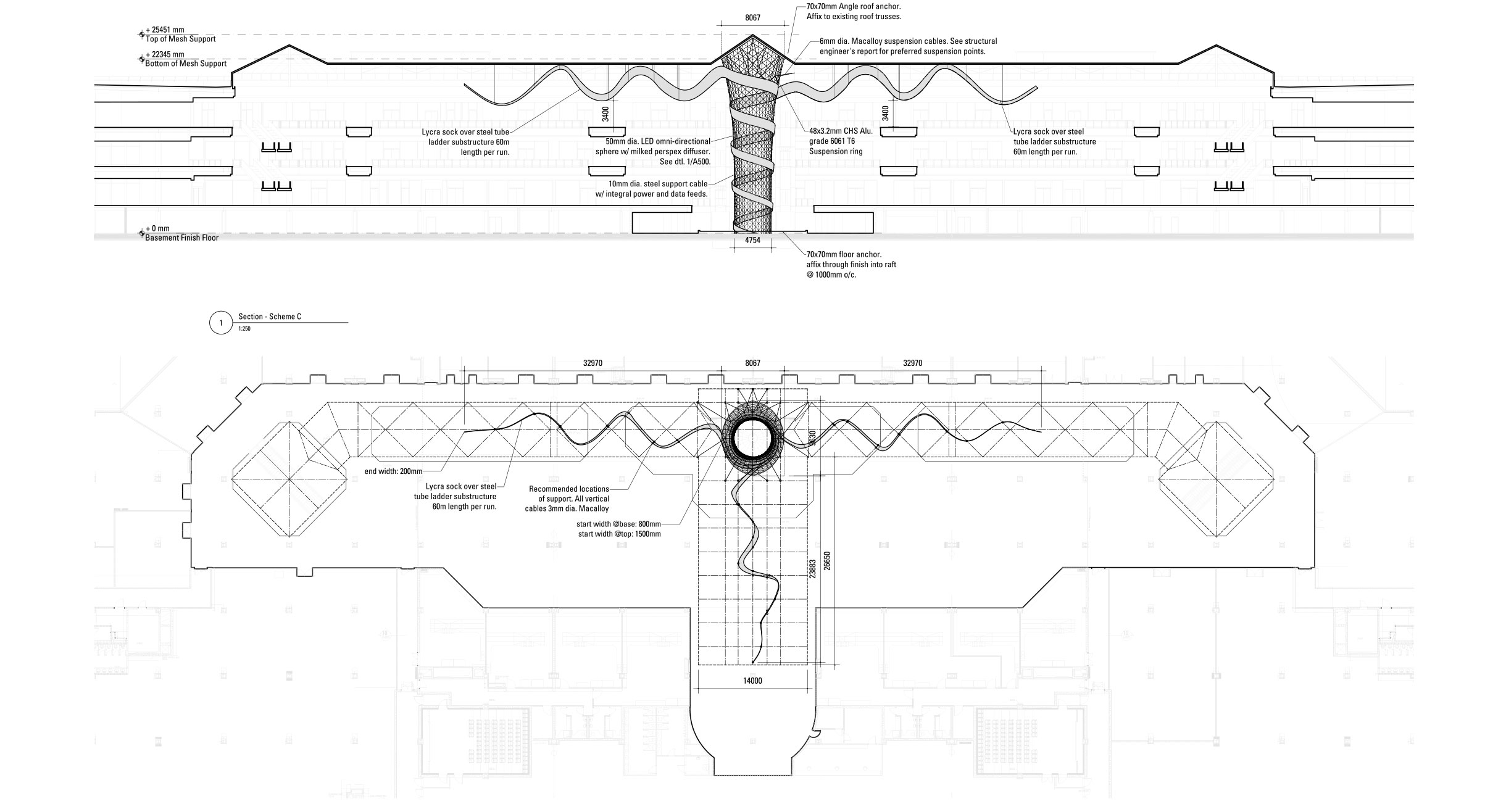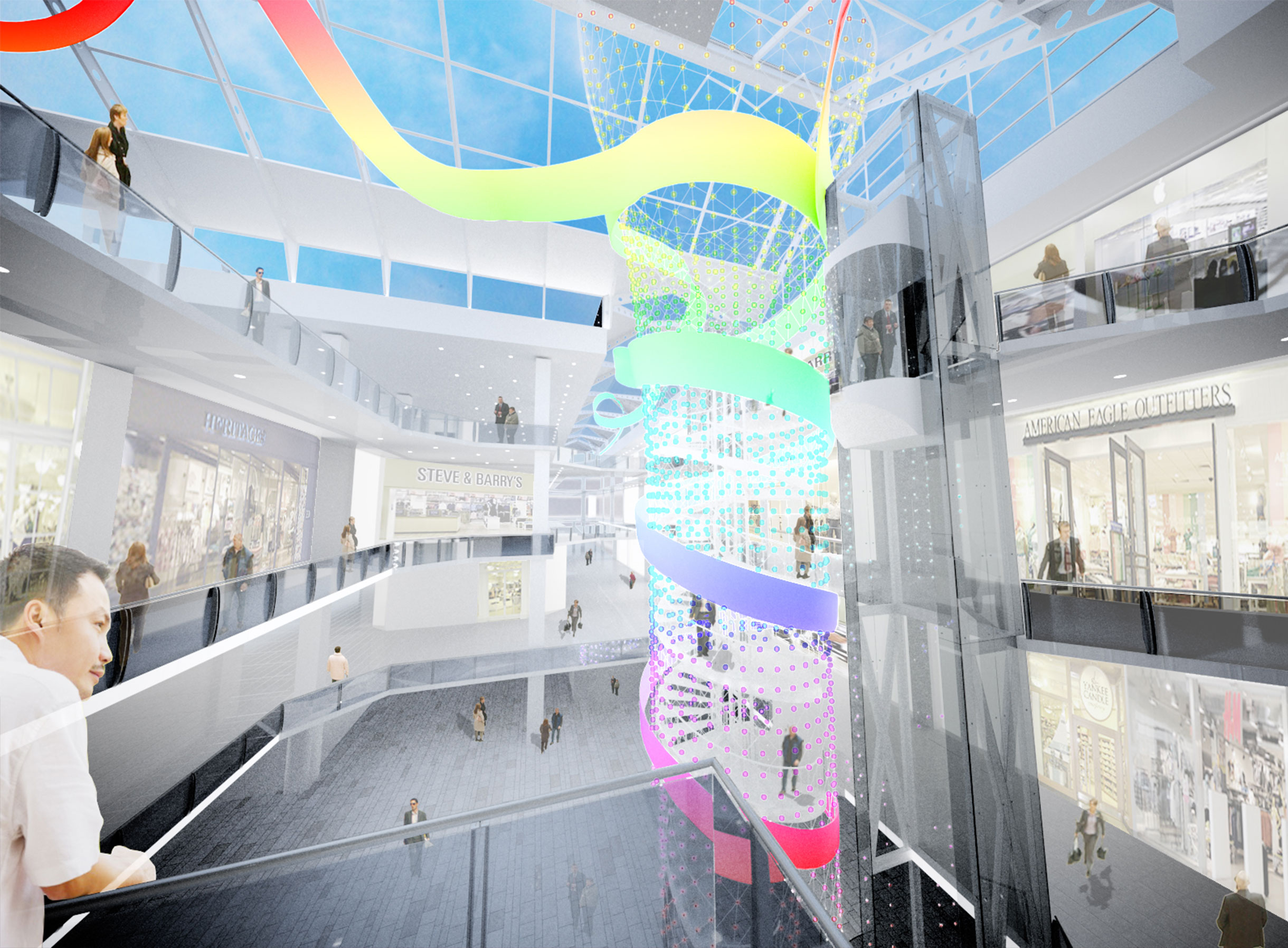 A dynamic installation of lightweight aluminum, fabric and LED mesh energizes Festival Mall.