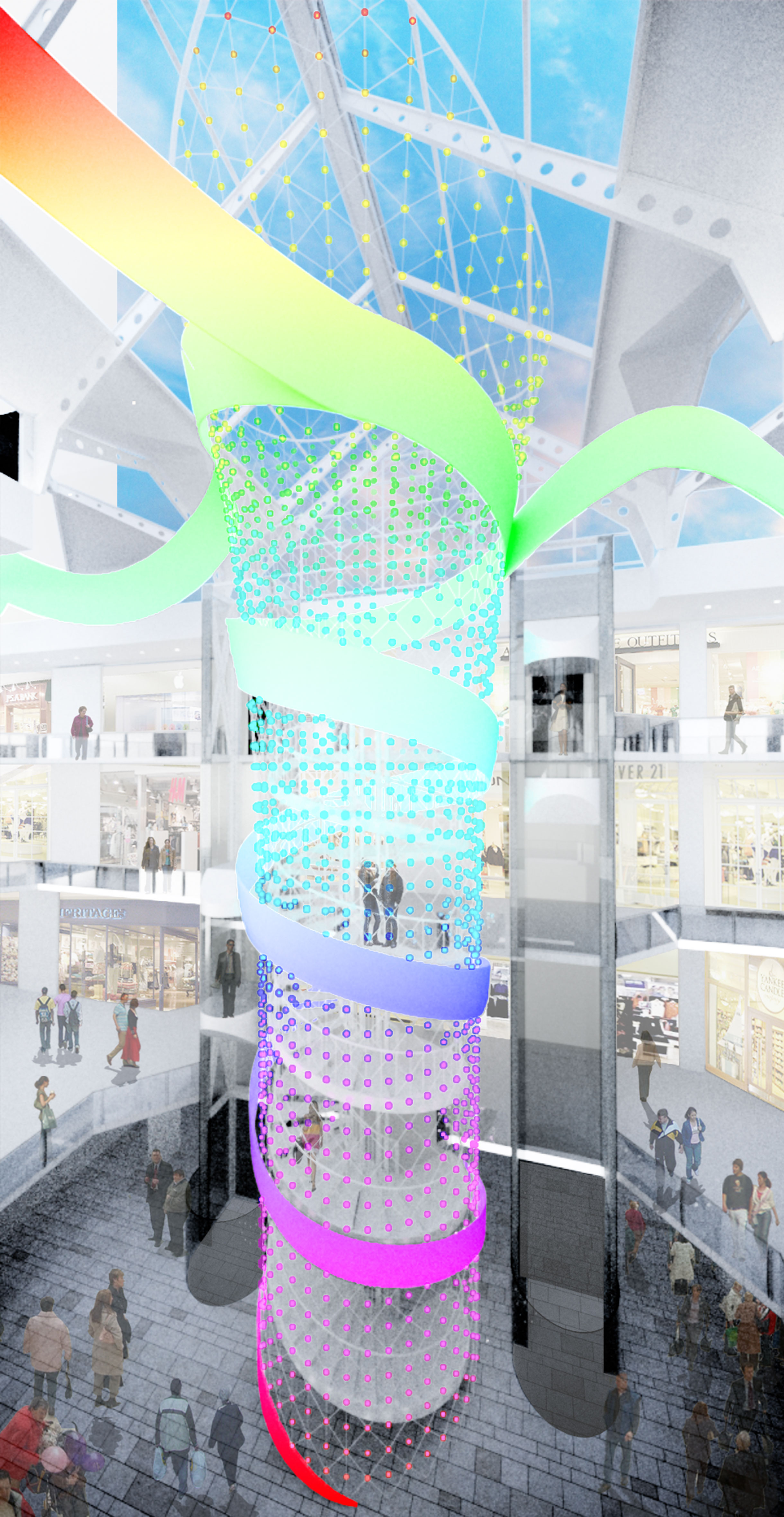 Circular was engaged to develop a cost-effective brand experience installation to energize and revitalize the central atrium court at Moscow's Festival Mall. Leveraging the existing spiral staircase and atrium structure, a swirling mesh of LED lights and illuminated fabric ribbons creates a vortex of color which extends out from the central circulation core down the opposing wings and leads visitors towards the cinema anchor. The design integrates the Mall's polychromic ribbon branding and creates a new spatial element to unify the shopping areas with the cinemas and food court above.