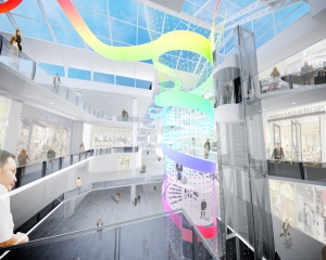 A branded corporate interior takes visitors on a journey from microscopic to global scale.