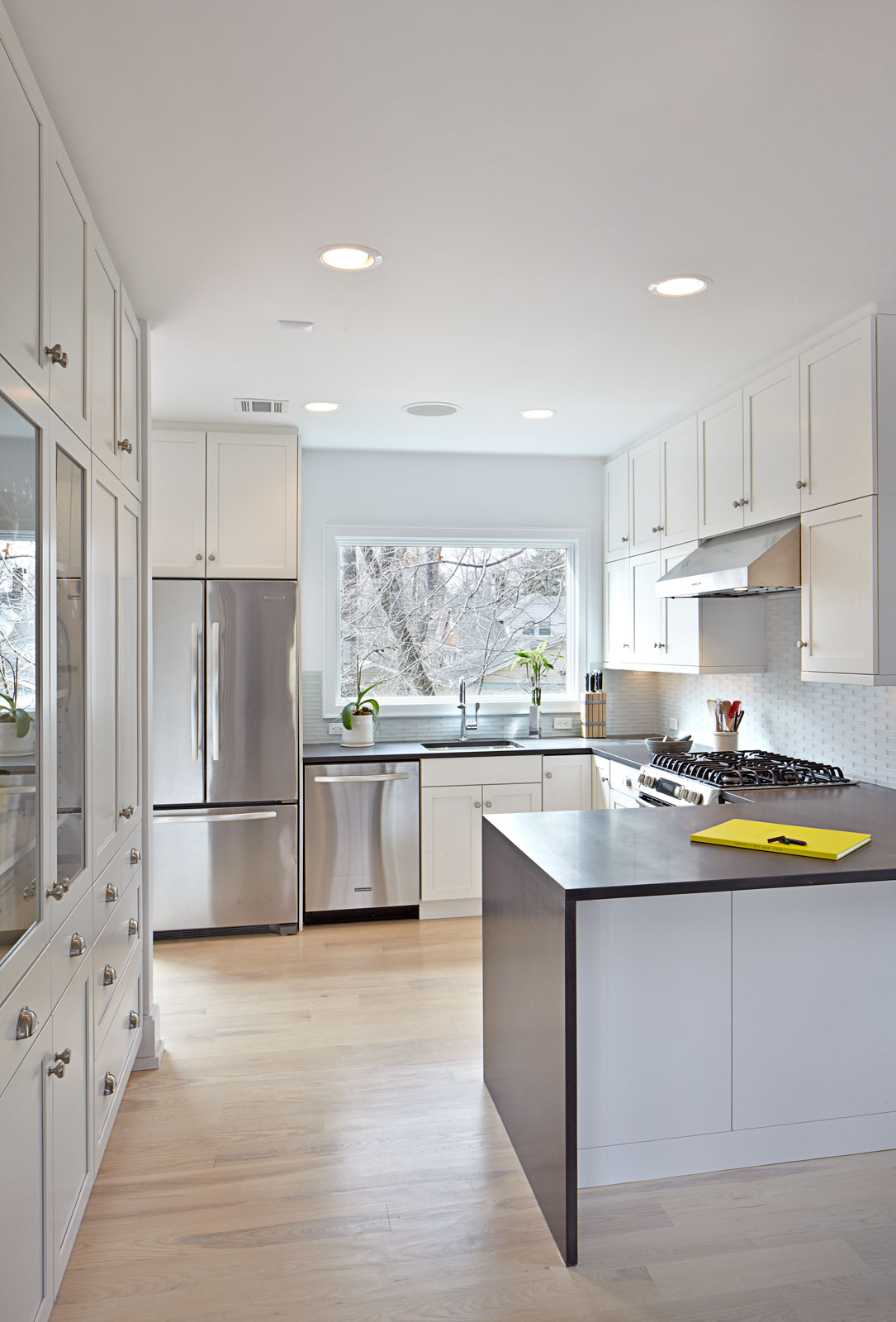 This modest 1920's Dutch Colonial had seen very little work since the Carter administration. A complete renovation to accomodate the client's young family would include a modern kitchen, reworking bedrooms, finishing the basement, and adding space for additional bathrooms, a family room and study. Taking advantage of tax credits for increasing energy efficiency, the entire house was gutted and re-insulated, reclad and upgraded with new windows, electric, HVAC, plumbing and radiant heating. In order to accommodate the expanded program a contextual addition was designed to both blend harmoniously with the existing structure, and to maximize the buildable area within the stringent local zoning and building regulations.