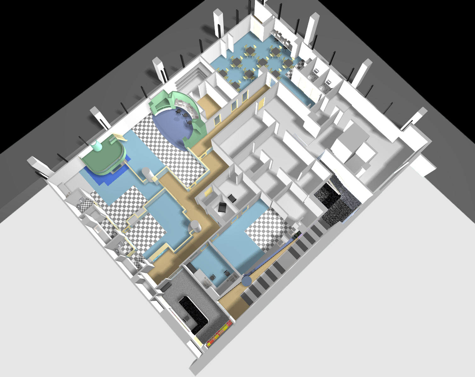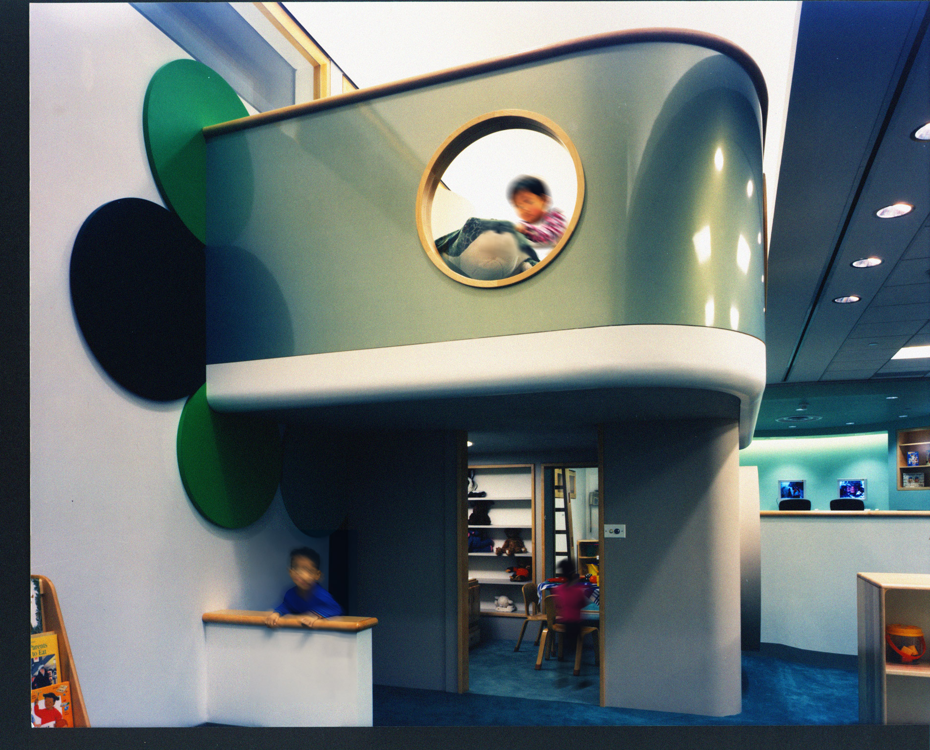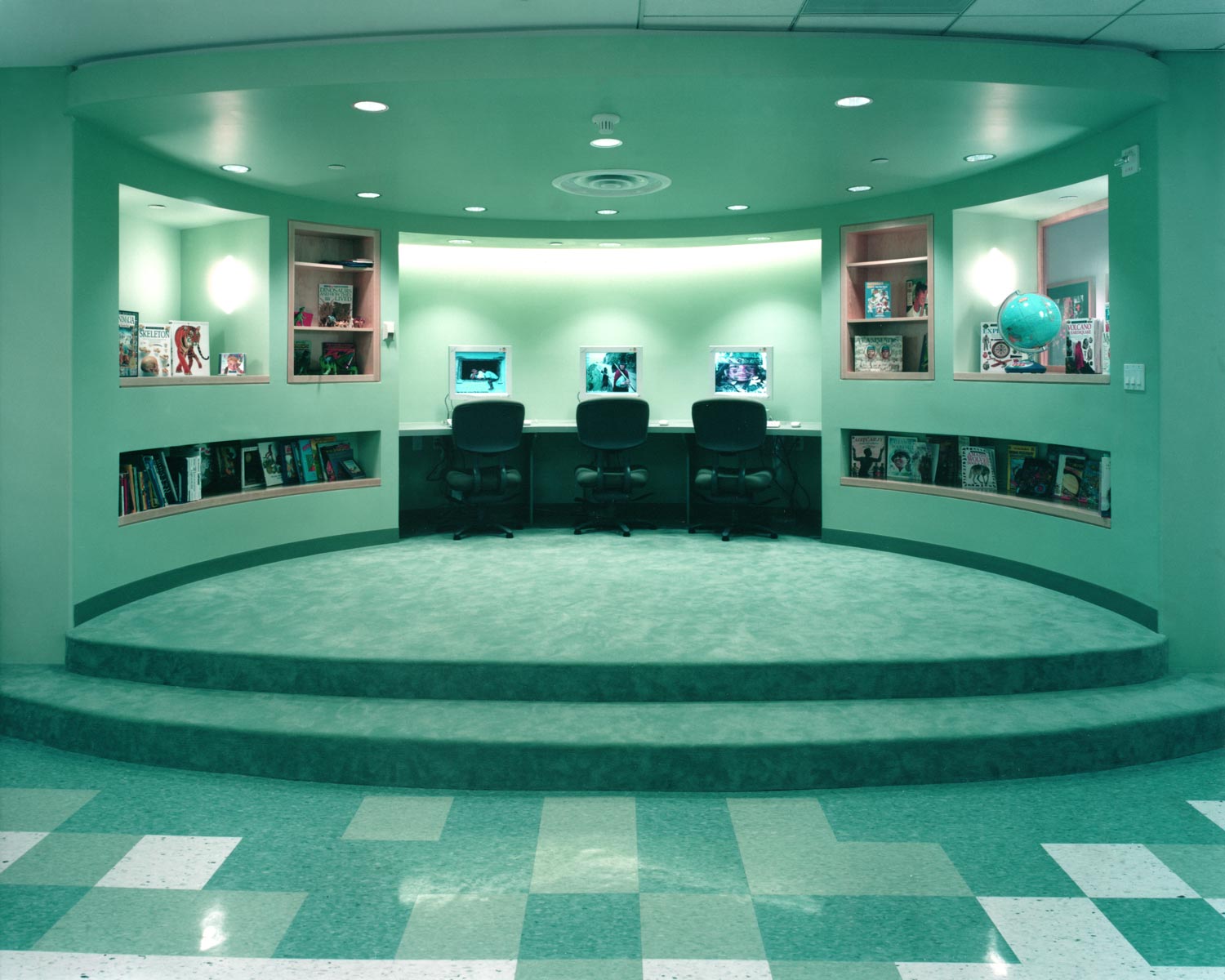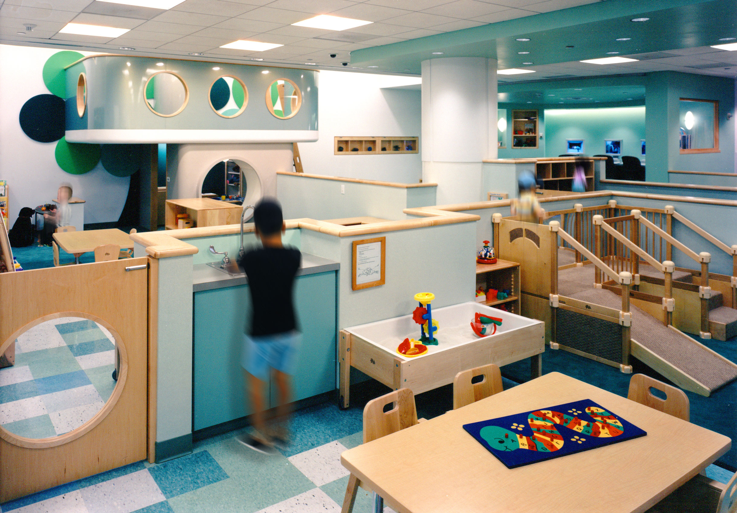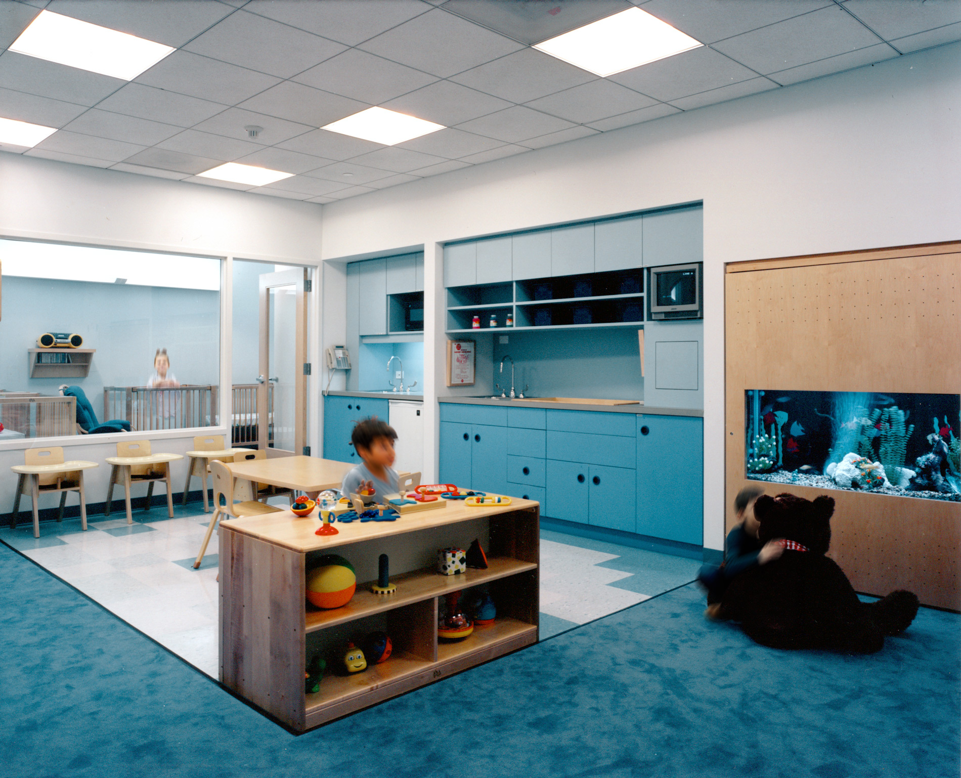 As a back-up center, the facility accommodates children ranging from infant-age to 12. The center is divided into four classroom areas, using partial height walls with embedded fishtanks, terraria and display cases. Each classroom has a unique tropical aquarium, showcasing aquatic life from different regions of the world.