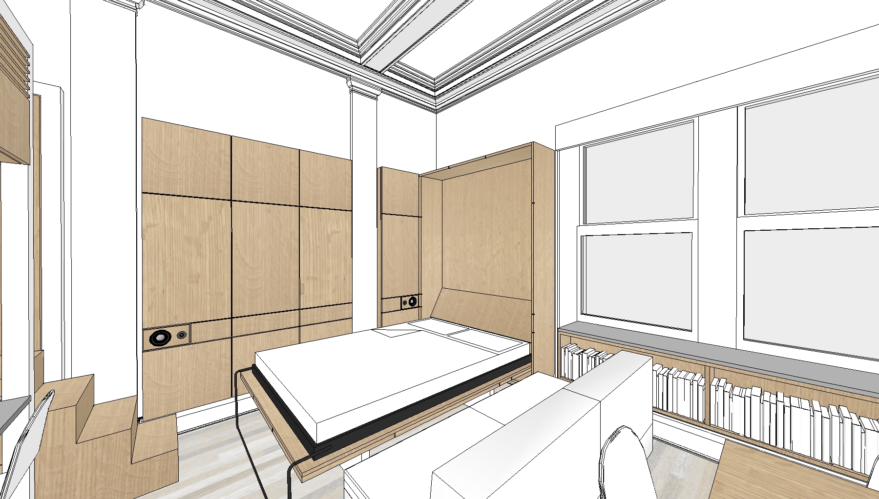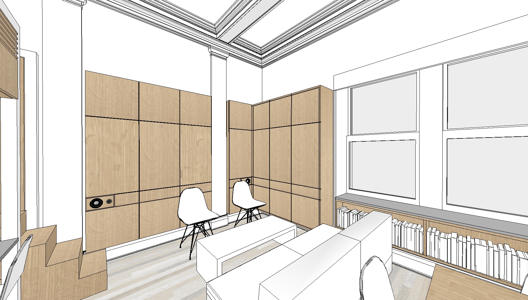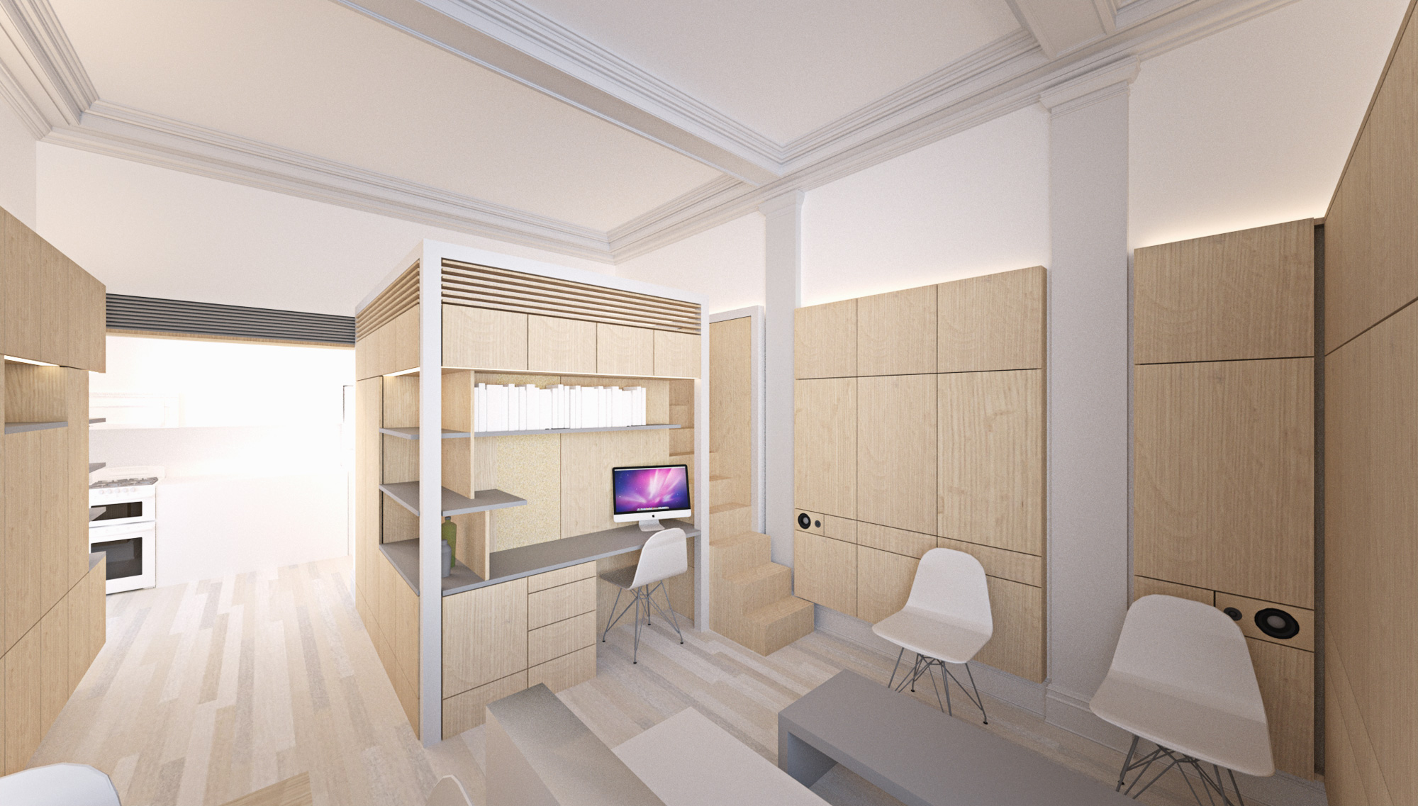The homeowner of this historic Upper East Side studio desired a highly functional space adaptable to many different potential users. This led to a system of transforming components which serve to store away and conceal various pieces of equipment, surfaces and furniture. Tight budget constraints and a narrow installation window suggested the system be built offsite in prefab components and installed with minimal disruption to the homeowner. The resulting proposal is an open, elegant adaptable space which conceals a plethora of uses in a minimal envelope.