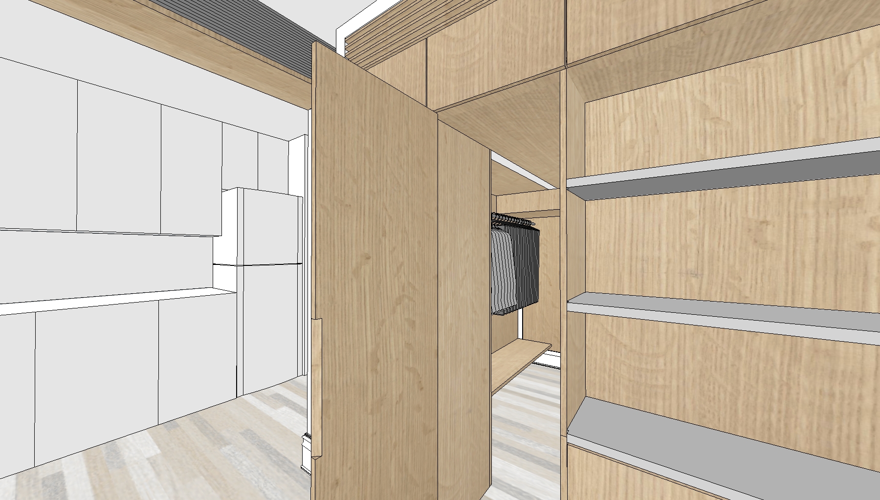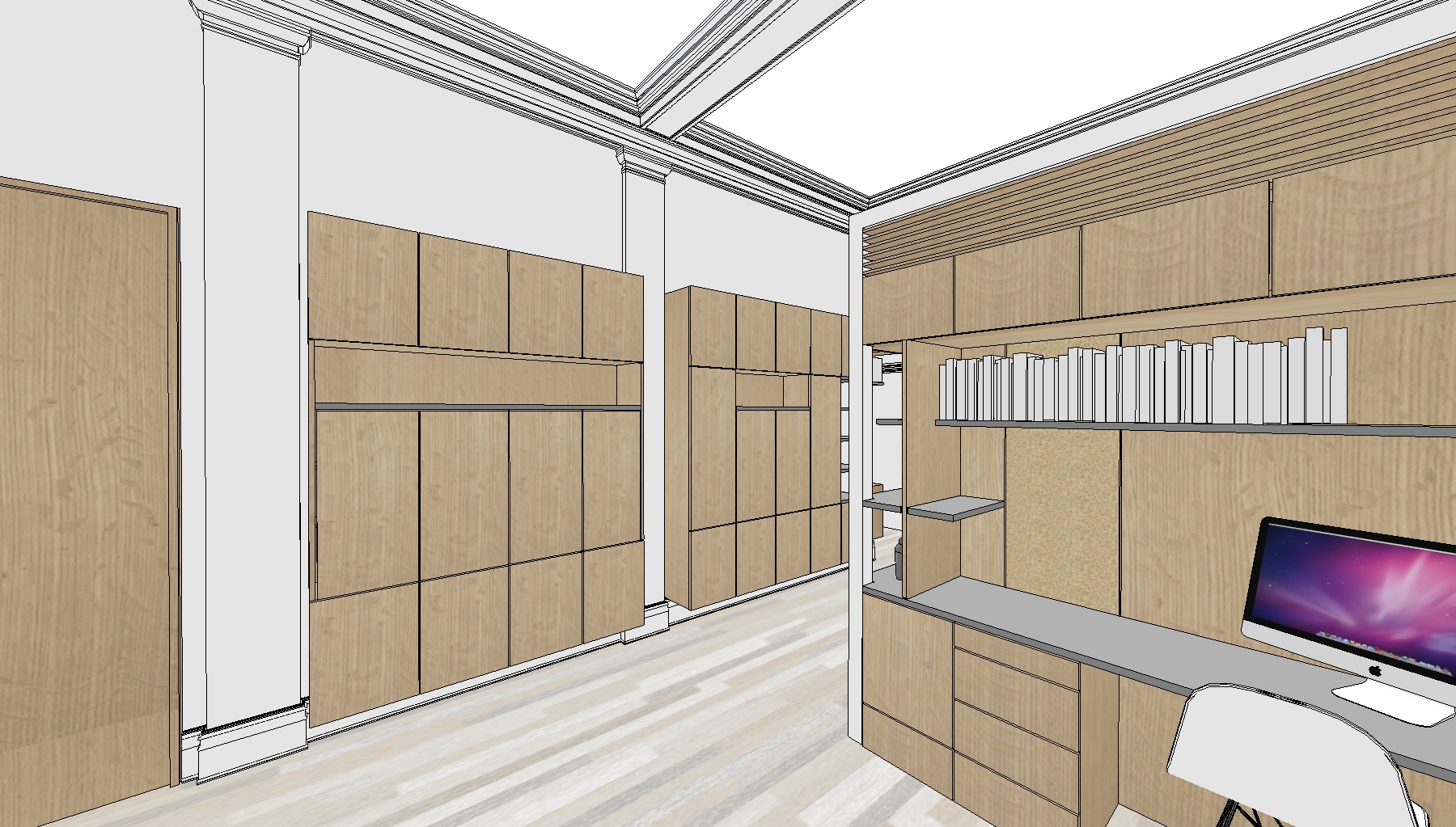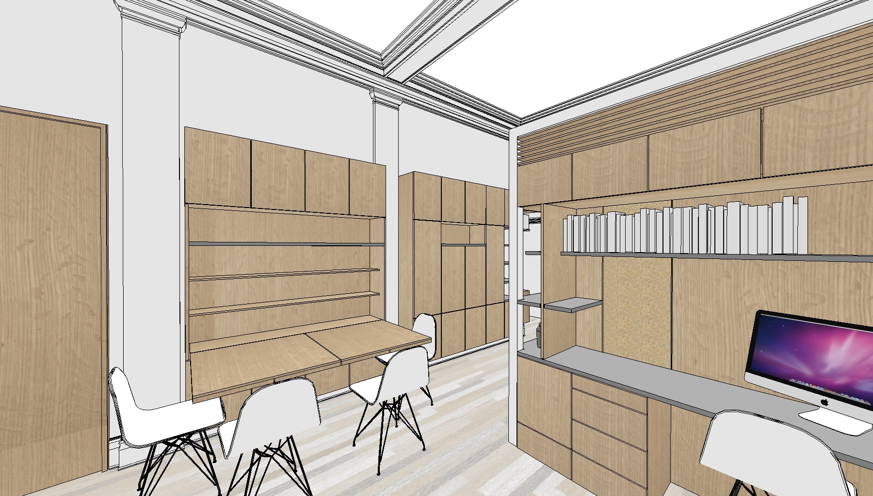 The homeowner of this historic Upper East Side studio desired a highly functional space adaptable to many different potential users. This led to a system of transforming components which serve to store away and conceal various pieces of equipment, surfaces and furniture. Tight budget constraints and a narrow installation window suggested the system be built offsite in prefab components and installed with minimal disruption to the homeowner. The resulting proposal is an open, elegant adaptable space which conceals a plethora of uses in a minimal envelope.