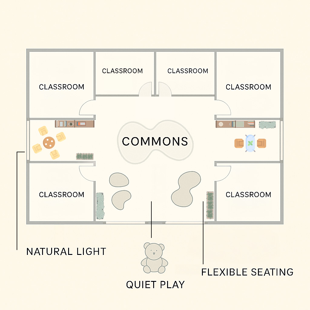 Commons give children space to breathe. They allow for unstructured play, gentle transitions between activities, and moments of quiet observation. These kinds of spatial cues can support emotional regulation, reduce stress, and help children build confidence in social situations — all foundational elements of mental health.
