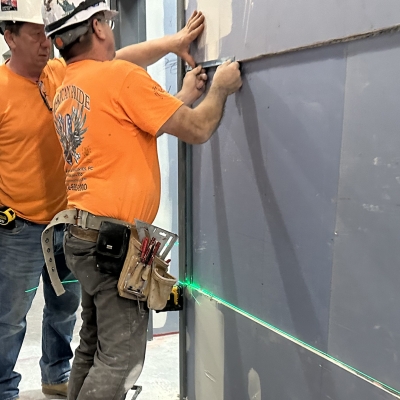 Terrazzo tile flooring was selected for the lobby and vestibule to complement the aesthetic of the milwork, wall tiles and ceiling treatment. Considering the high foot traffic anticipated throughout the building's lifespan, durability was a key factor in material choice, while still adhering to the program's budget constraints. The installation process involved careful work, with precise cutting and placement of the 24” x 24” tiles to align with the wall patterns and lines.