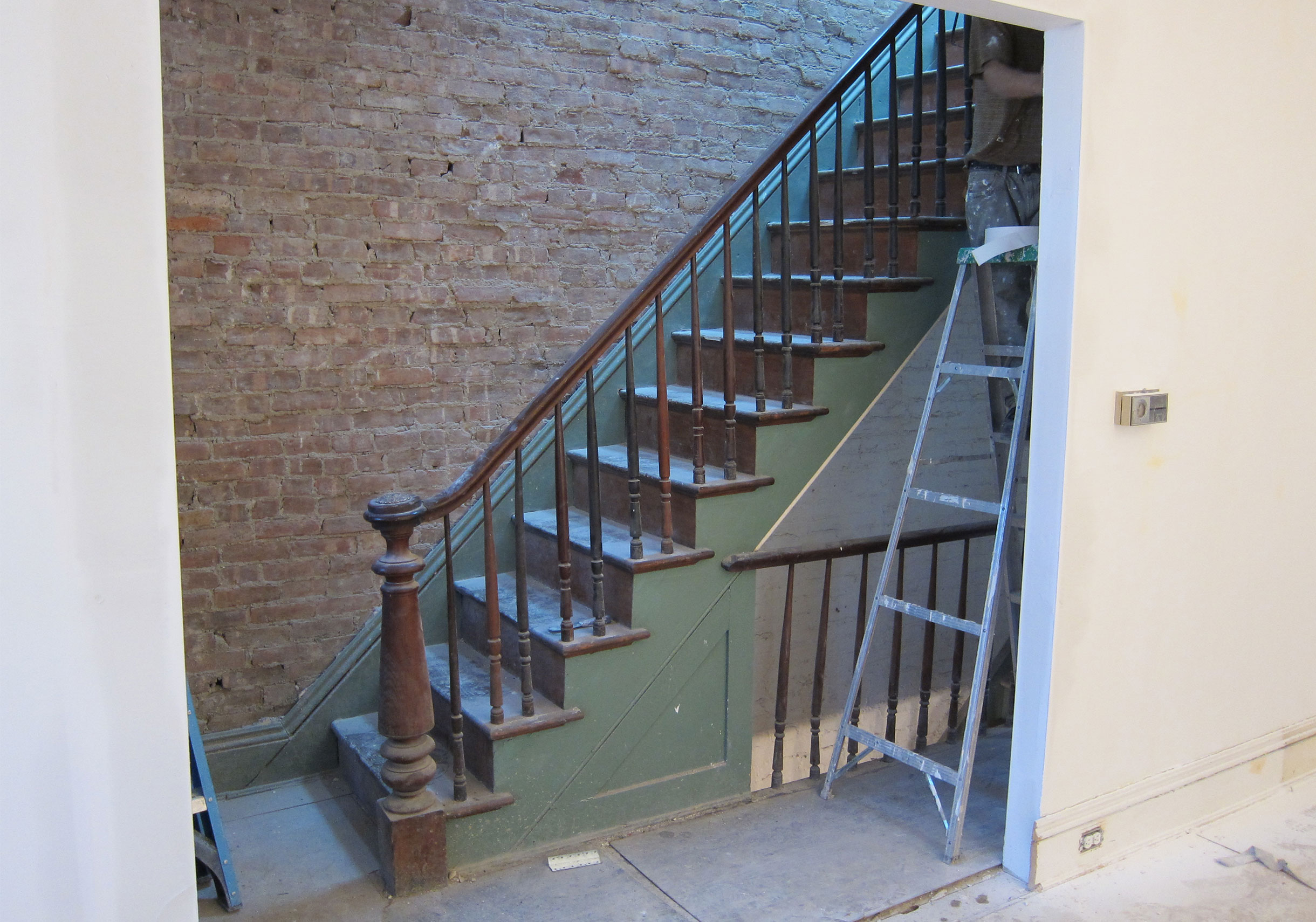 As rough-in continues, there’ve been a couple of nice developments on the job site. First the windows have been installed. The clean white oak sashes look fantastic – such an improvement over the old vinyl windows. Second, after seeing how striking the light is coming in from the skylight, the owners have agreed to widen the opening to the living room on the parlor floor. During design development we were hoping to remove this wall entirely but the structural work required was just a bit out of budget. This is a good compromise.